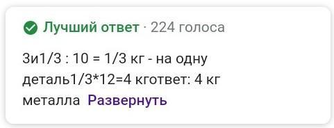 для изготовления 10 деталей требуется 3 1/3 3кг металла. сколько металла пойдёт на изготовление 12 таких деталей? можно подробно и фото6класс