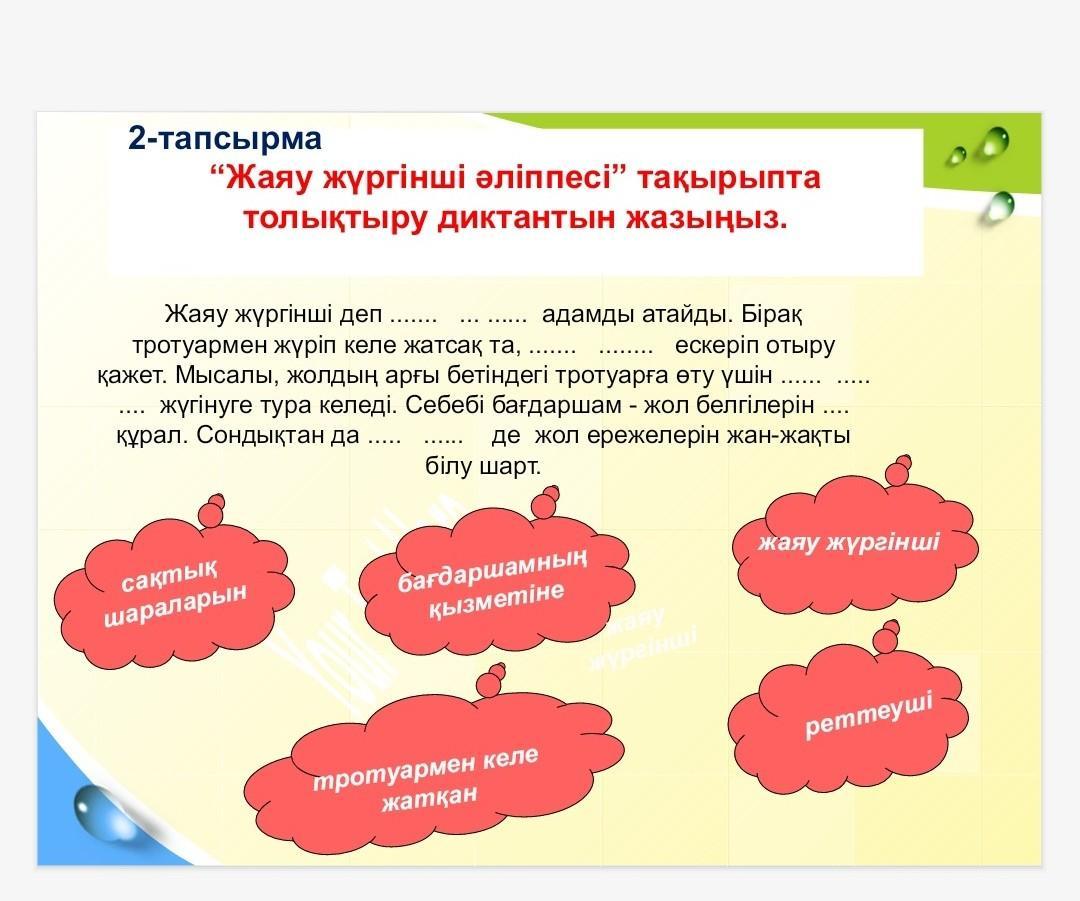 Ответ:1. Тротуармен келе жатқан 2. Сақтық шараларын 3.бағдаршамның қызметіен 4. Реттеуші 5. Жаяу жүргінші