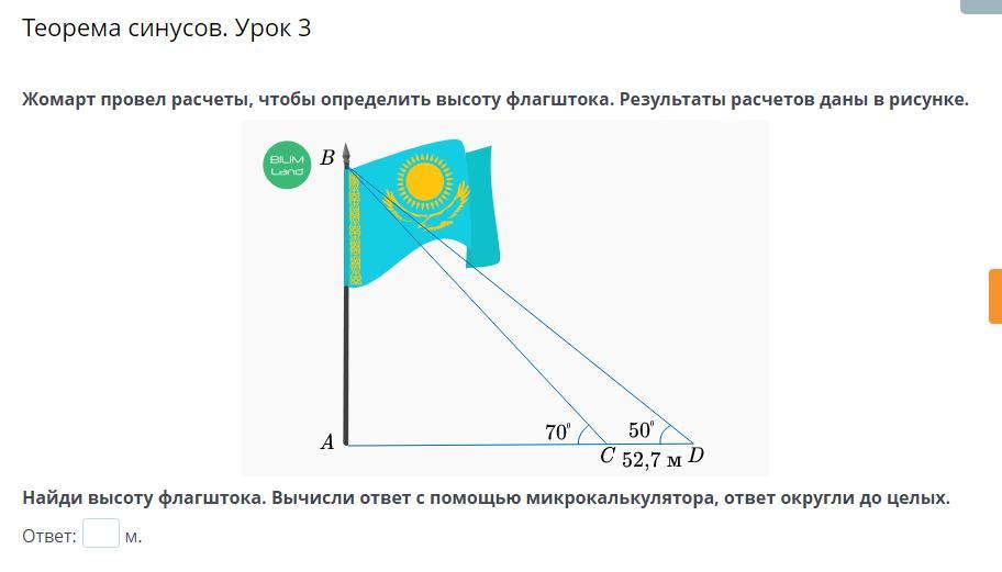 Жомарт провел расчеты, чтобы определить высоту флагштока. Результаты расчетов даны в рисунке. Найди высоту флагштока. Вычисли ответ с помощью микрокалькулятора, ответ округли до целых.