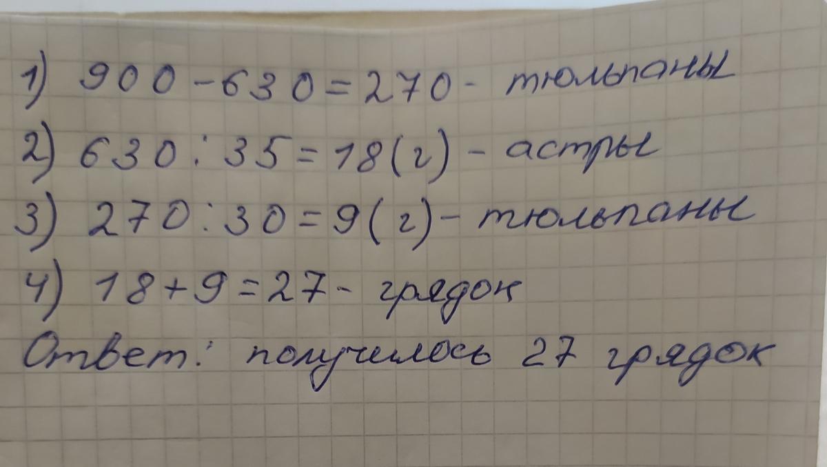 грядку, а тюльпаны — по 30 штук. Сколько получилось грядок?сделайте в тетради