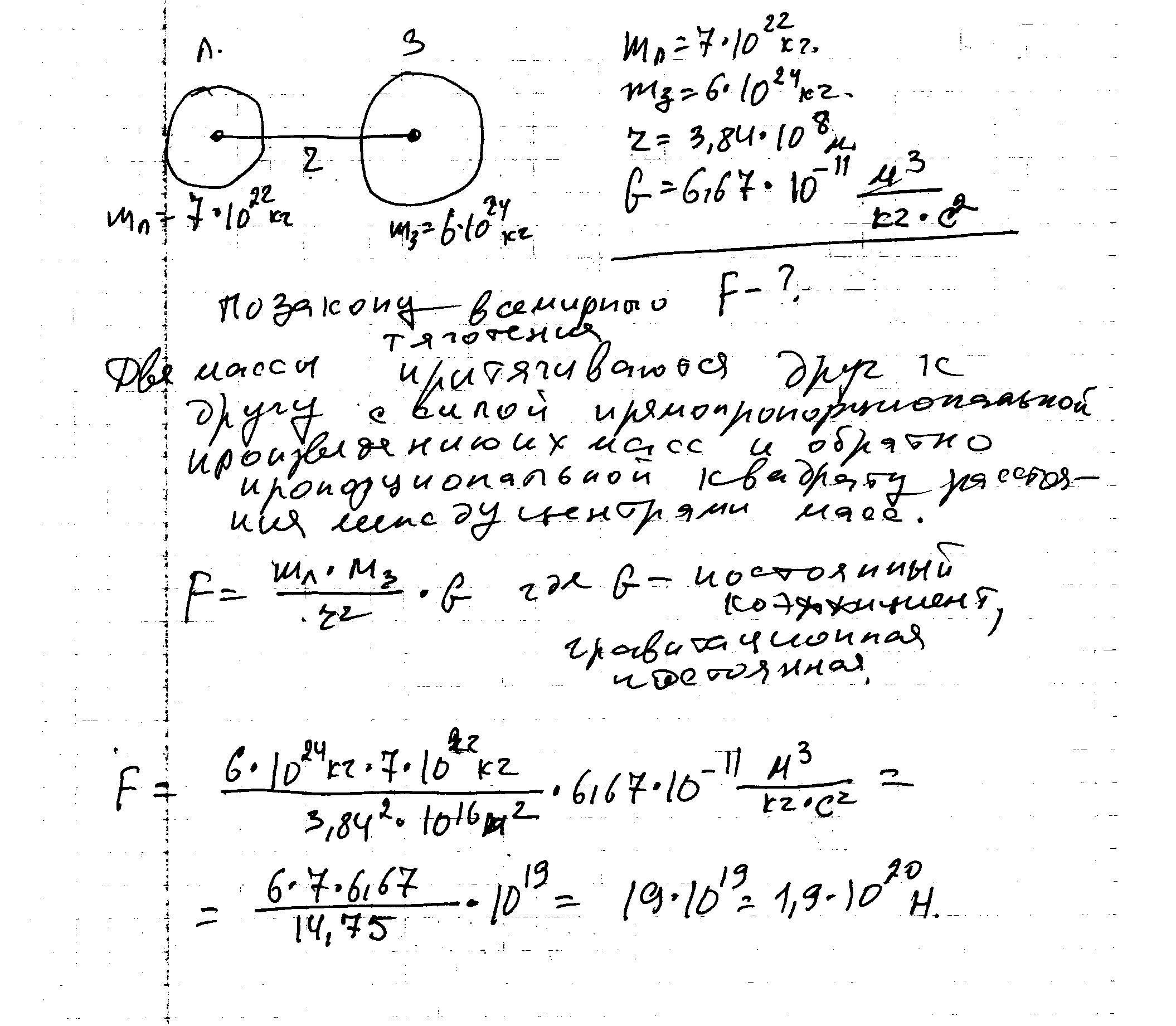 с какой силой земля притягивает луну если масса земли 6*10^24кг а масса луны 7*10^22кг?расстояние между их центрами 3,84*10^8.с какой силой луна притягивает землю?решение и ответ