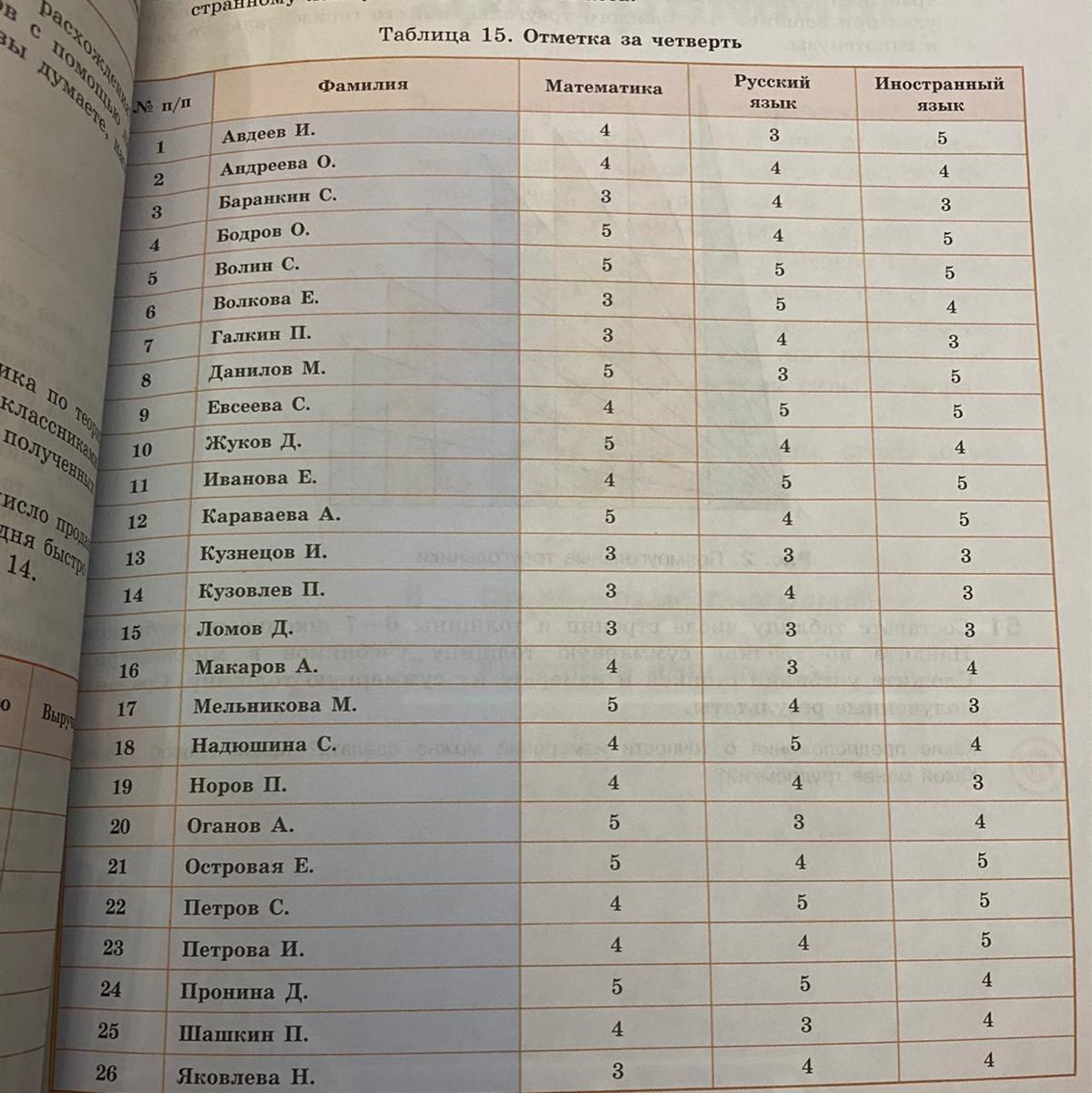 114 В таблице 15 (см. с. 22) даны четвертные отметки учащихся класса.