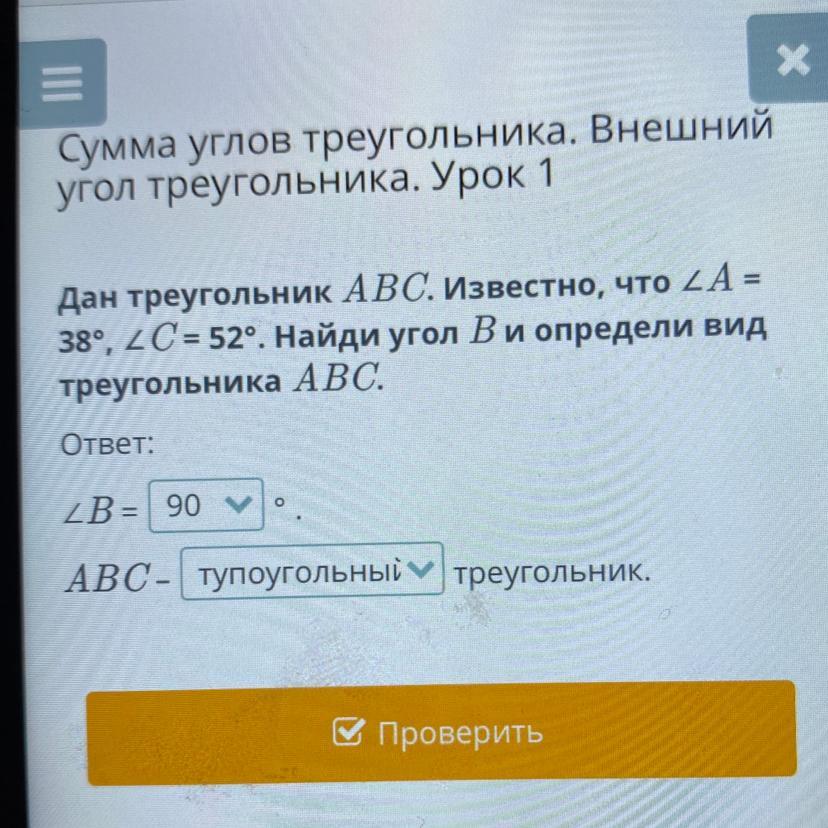 угол B=90°, если в треугольнике есть угол в 90°, то он прямоугольный