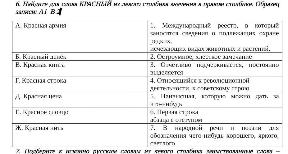 6. Найдите для слова КРАСНЫЙ из левого столбика значения в правом столбике. Образец записи: А1 В 2