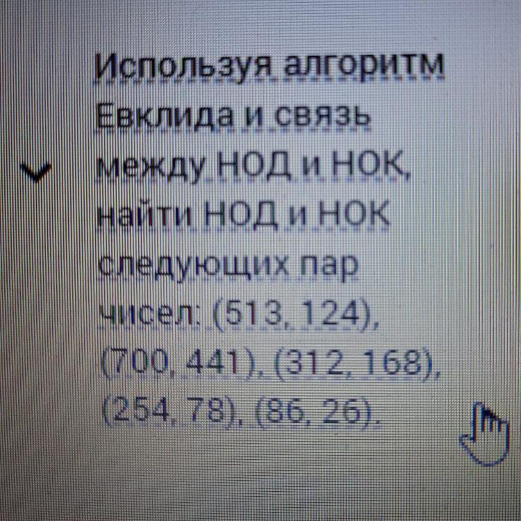 СРОЧНО!!!!!Помогите пожалуйста!!!Используя алгоритм Евклида и связь между нод и нок,найти НОД и НОК чисел: (513,124) (700,441) (312,168) (254,78) (86,26)