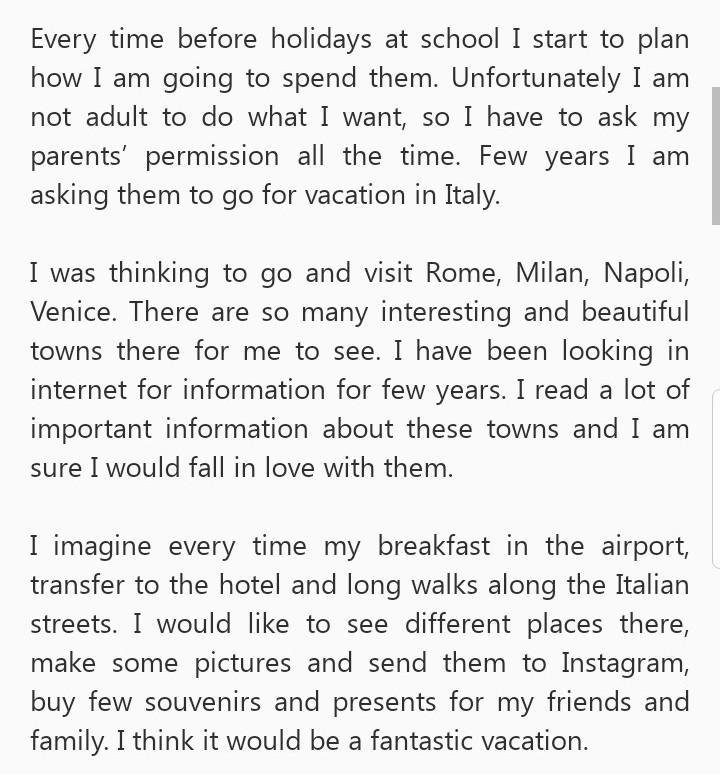 Мен әр демалыстың алдында мектепте қалай өткізетінімді жоспарлай бастаймын. Өкінішке орай, мен қалағанымды жасау үшін ересек емеспін, сондықтан мен үнемі ата-анамнан рұқсат сұрауым керек. Бірнеше жыл мен олардан Италияға демалуға баруды сұраймын. Мен Римге, Миланға, Наполиге, Венецияға баруды ойладым. Онда мен көруге болатын көптеген қызықты және әдемі қалалар бар. Мен бірнеше жыл бойы интернеттен ақпарат іздедім. Мен бұл қалалар туралы көптеген маңызды ақпаратты оқыдым және оларға ғашық болатыныма сенімдімін. Әуежайдағы таңғы асты, қонақ үйге ауысуды және итальяндық көшелермен ұзақ серуендегенді елестетемін. Мен ол жерде әр түрлі жерлерді көргім келеді, суреттер салып, оларды Instagram-ға жіберемін, достарыма және отбасыма бірнеше кәдесыйлар мен сыйлықтар сатып аламын. Менің ойымша, бұл керемет демалыс болар еді.