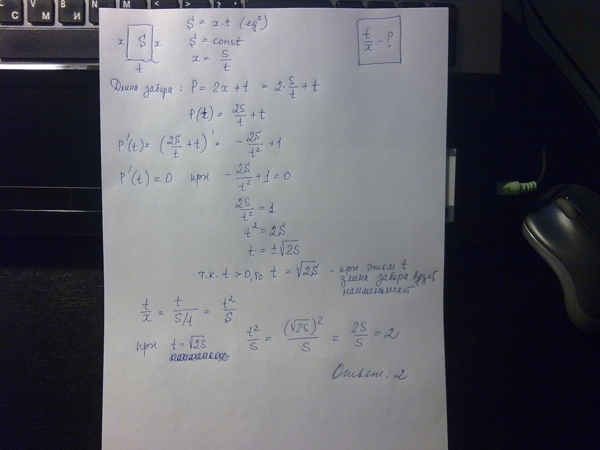 Выбирается участок земли в форме прямоугольника заданной площади S; три стороны этого прямоугольника являются забором, четвертая сторона- берег Моря, на котором забор не строится. Определить t - отношение стороны прямоугольника, расположенной вдоль Моря, к стороне, перепендикулярной берегу, - при котором длина забора будет наименьшей.(Через производную)