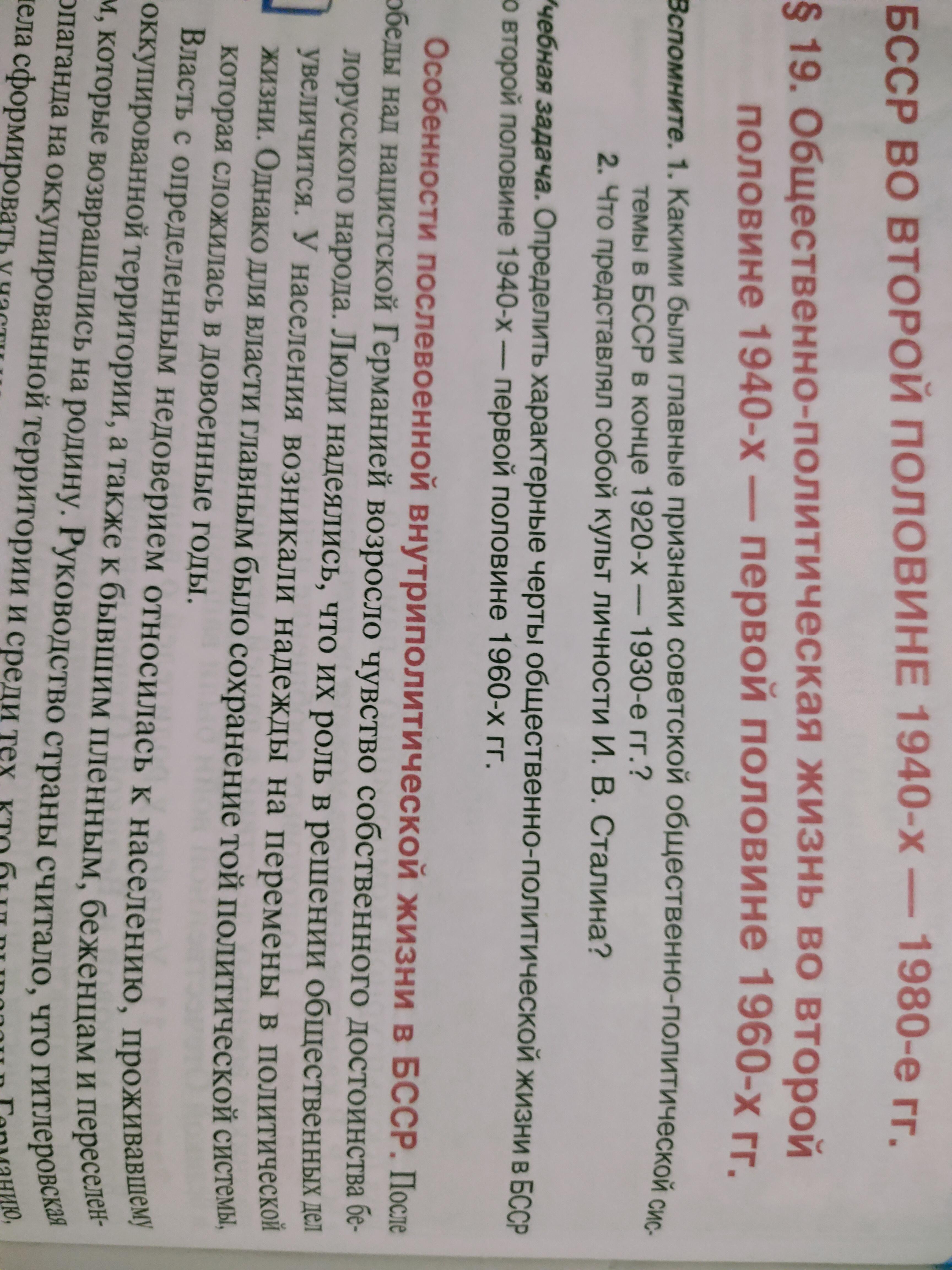 1:Вводилось новое административно-территориальное деление. Теперь территория БССР делилась на области, районы и сельсоветы. Ядром общества являлась коммунистическая партия Беларуси (КП(б)Б), которая определяла основные направления внутренней и внешней политики, организовывала их выполнение. В 1932 – 1937 гг. белорусскую партийную организацию возглавлял Н. Гикало. Высший законодательный орган – Верховный Совет БССР (до 1937 г. Всебелорусский съезд Советов и ЦИК БССР), до 1937 г. его возглавлял А. Червяков. Высший орган исполнительной власти – Совет народных комиссаров БССР, который до 1937 г. возглавлял Н. Голодед. Построена вертикаль судебной власти. Она начиналась от Верховного суда и заканчивалась городскими и районными судами. В 1932 – 1933 гг. был введен паспортный режим. Сельские жители паспорта не получили. Усиливалась централизация в руководстве страной, насаждались административно-директивные методы управления, повышалась роль партийно-государственного аппарата, формировался мощный репрессивный аппарат.