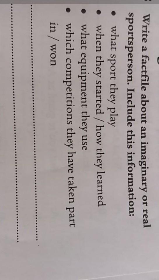 Writing напишите Напишите файл фактов о воображаемом или реальном спортсмене. Включите эту информацию: каким видом спорта они занимаются, когда начали / как они узнали, какое оборудование они используют, в каких соревнованиях они принимали участие / выиграли