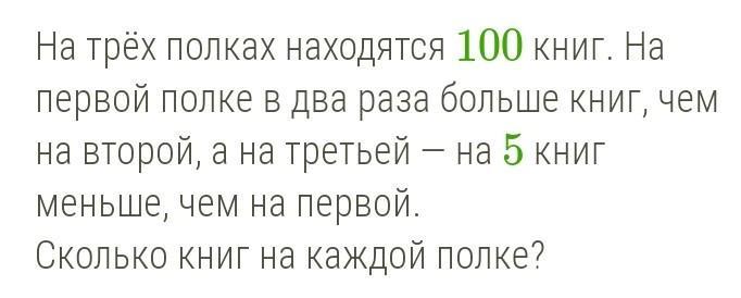 2х+х+2х-5=100 5х-5=100 х-1=20 х=21 книг на 2 полке 21*2=42 книг на 1 полке 42-5=37 книг на 3 полке