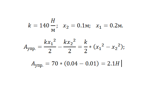 Пружину с жесткостью 140 Н/м сжали до длины 0,1 м и отпустили. Работа, совершенная силой упругости при восстановлении пружины равна ..... Дж. Если длина недеформированной пружины равна 0,2 м.