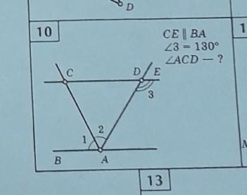 Obyasnenie:(mi znaem chto summa smejnix uqlov ravna 180) esli uqol 3 raven 130 to:180-130=50(ADC),(a mi eshyo znaem chto uqli pri osnovanii toje ravni)to est:ACD=ADC i vixodit chto ACD=50