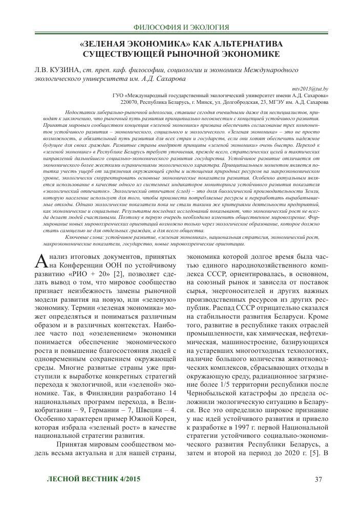 Зелëная эконо́мика — направление в экономической науке, сформировавшееся в конце XX века, в рамках которого считается, что экономика является зависимым компонентом природной среды, в пределах которой она существует и является её частью. Концепция зелёной экономики включает в себя идеи многих других направлений в экономической науке и философии, таких как феминистическая экономика[en], постмодернизм, ресурсо-ориентированная экономика, экологическая экономика, экономика окружающей среды, антирост, антипотребительство, антиглобализм, зелёный анархизм, зелёная политика, теория международных отношений и др.
