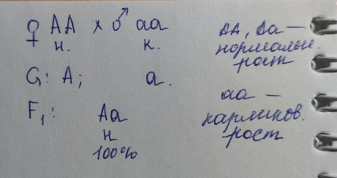 так как скрещивались гомозиготы по рецессивному и доминантному признакам, то потомство будет 100% гетерозиготным с доминантным признаком (в нашем случае, с нормальной высотой стебля)
