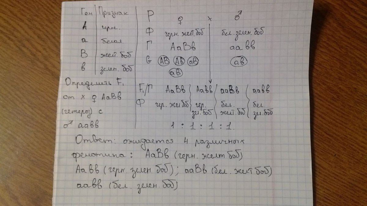 Сколько различных фенотипов ожидается в потомстве, полученном от скрещивания дигетерозиготного растения фасоли с чёрной окраской семенной кожуры и жёлтыми бобами(доминантные признаки) с растением, имеющую белую семенную кожуру и зелёную окраску бобов