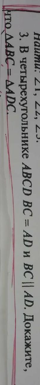 Рассмотрим треугольники абс и адс. ∠бса = ∠сад как накрест лежащие углы при параллельных прямых бс и ад(по условию) и секущей ас. так как ас-общая сторона, ∠бса=∠сад, бс=ад(по условию), то треугольник абс равен треугольнику адс по двум сторонам и углу между ними.