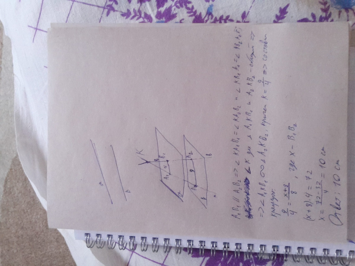2. через точку K не лежащую между параллельными плоскостями альфа и бета проведены прямые a и b. прямая a пересекает плоскости в точках A1 и A2 b -в точках B1 и B2 соотвественно найти B1B2 если A2B2= 9 см A1B1= 4 см KB1=8 см