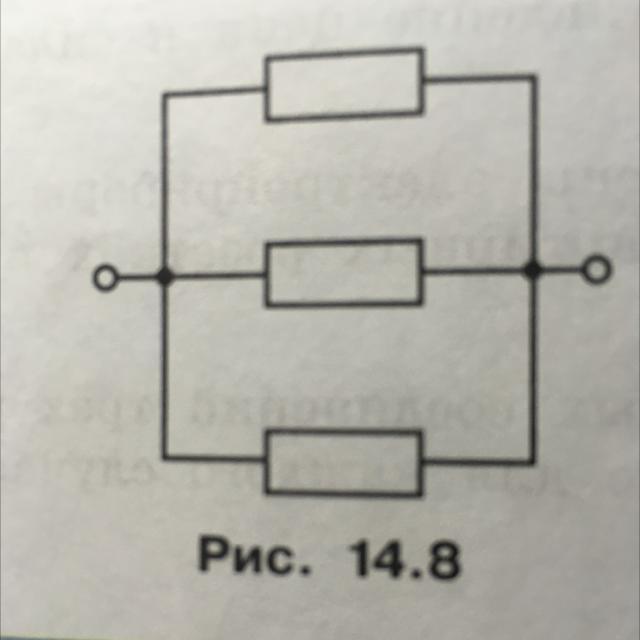На рисунке 14.8 изображена схема подключения трёх резисторов сопротивлениями 60 Ом каждый. Чему равна сила тока в каждом резисторе, если напряжение на участке цепи равно 18 В?