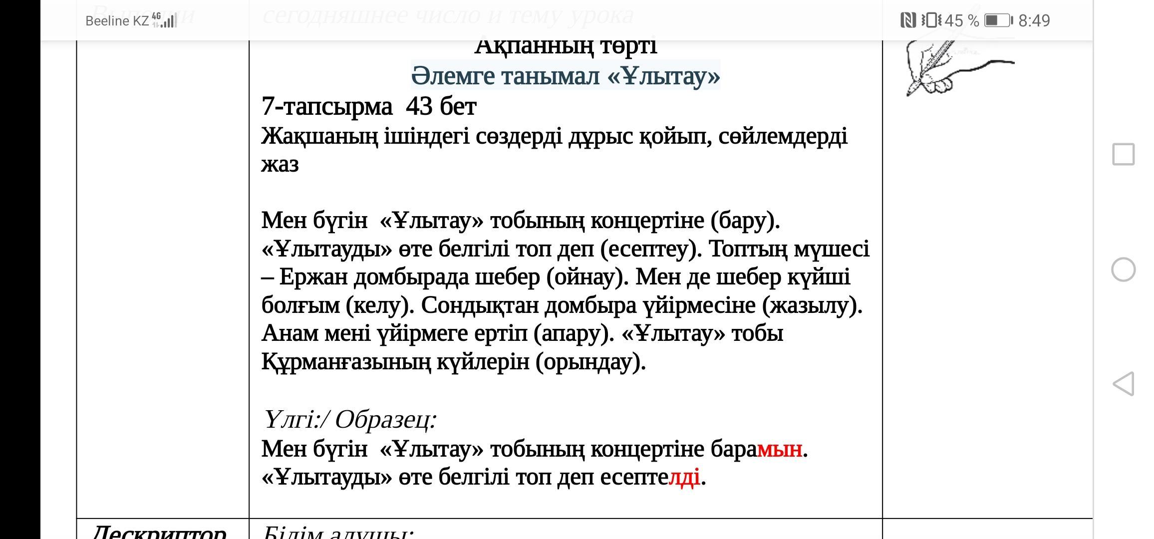 Ответ: барамын, есептелді, ойнайды, келеді, жазылдым, апарды, орындадық.