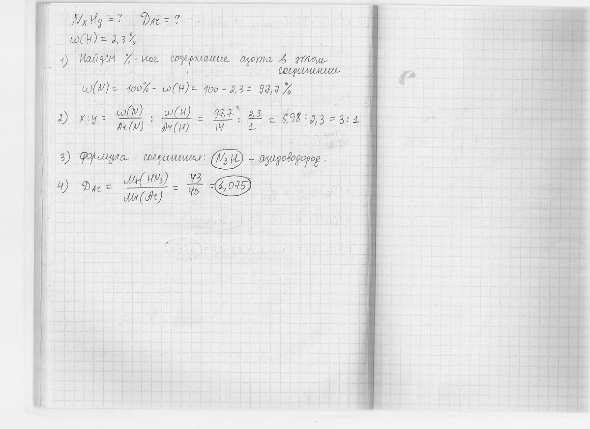 Определите молекулярную формулу соединения водорода с азотом, в котором массовая доля водорода составляет 2,3%. Рассчитайте плотность паров этого соединения по аргону.