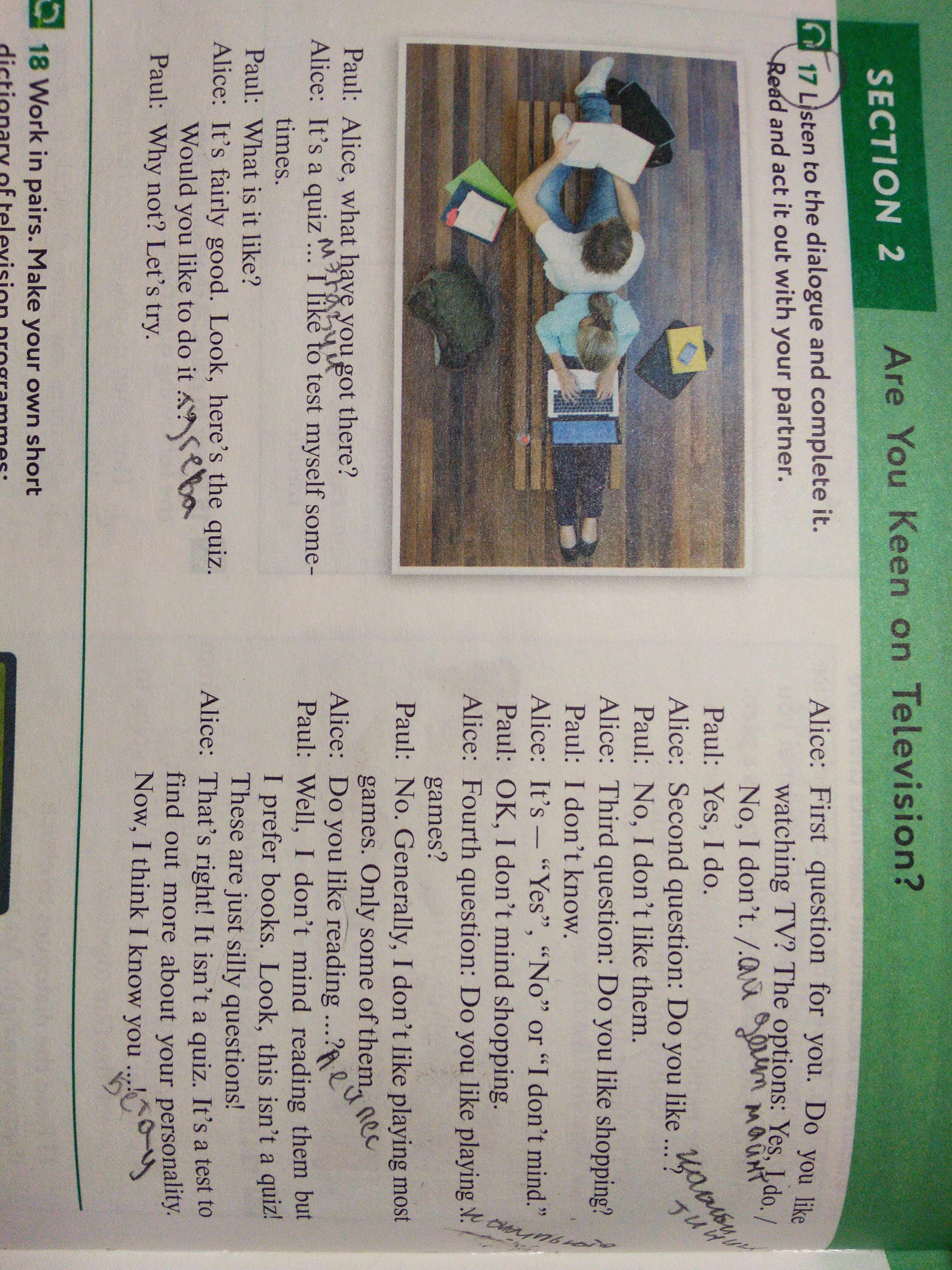 17 Прослушайте диалог и завершите его. Прочтите и разыграйте это вместе со своим партнером. Алиса: Первый вопрос к вам. Вам нравится смотреть телевизор? Варианты: Да, люблю. / Нет, не знаю. /.0a Пол: Да, знаю. yavby Алиса: Второй вопрос: Пол: Нет, они мне не нравятся. Алиса: Третий вопрос: вы любите делать покупки? Пол: Не знаю. тебе нравится Это- «Да», «Нет» или «Я не против» Пол: Хорошо, я не против покупок. Алиса: Четвертый вопрос: Тебе нравится играть в игры? Пол: Нет. Мне не нравится играть в большинство игр. Только некоторые из них, ec Алиса: Тебе нравится читать ...? e Пол: Ну, я не против их читать, но предпочитаю книги. Слушай, это не викторина! это просто глупые вопросы! Алиса: Верно! Это не викторина. Это тест, чтобы узнать больше о вашей личности. Теперь я думаю, что знаю вас Пол: Алиса, что у вас там? Алиса: Это викторина ... Мне нравится иногда проверять себя ... D. Пол: Каково это? Алиса: Достаточно хорошо. Послушайте, вот викторина. Не хотите ли вы пройти это? Пол: Почему бы и нет? Давайте попробуем.
