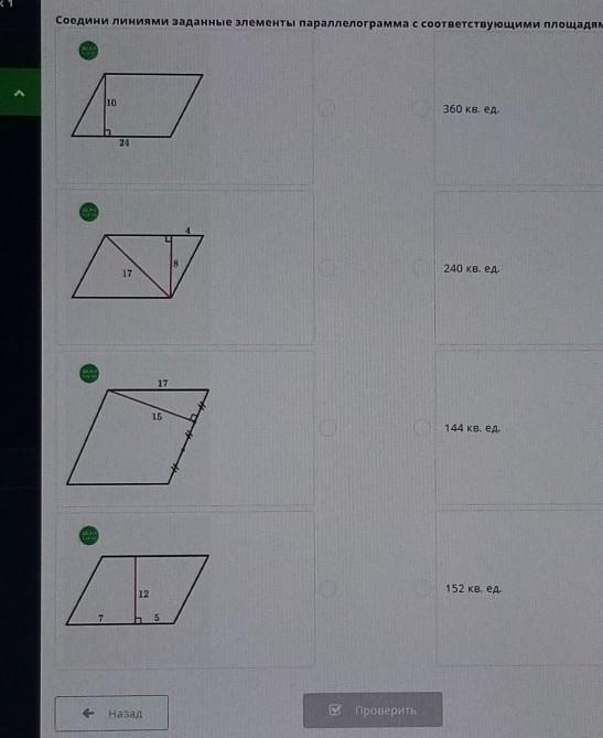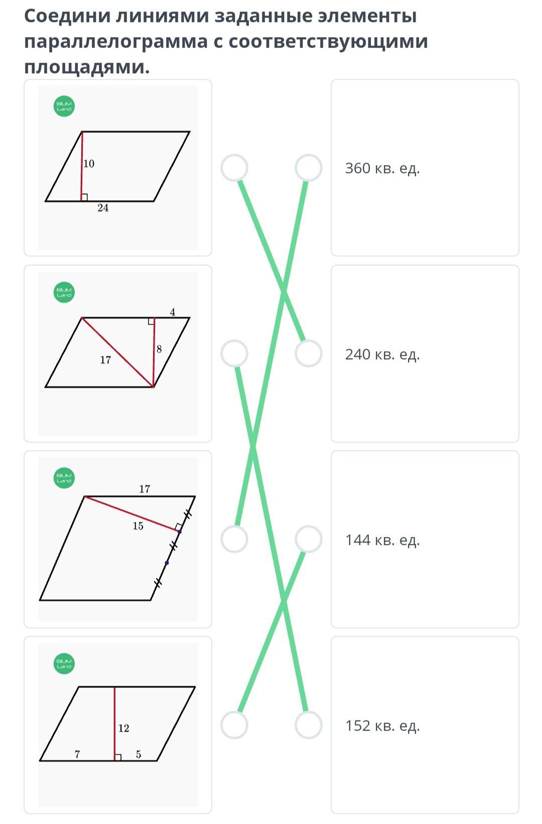 Соедини линиями заданные элементы параллелограмма с соответствующими площадями.