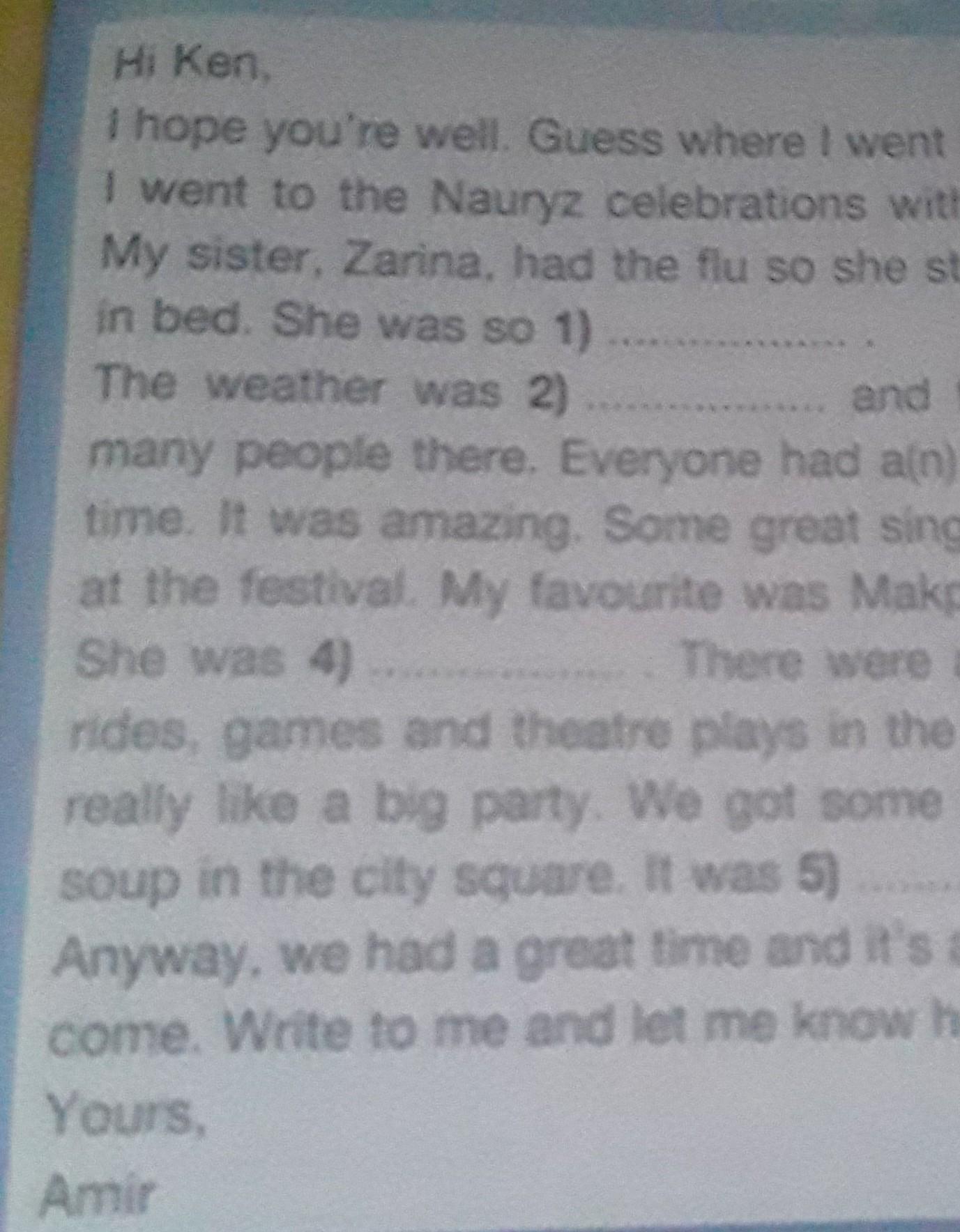 I hope you're well. Guess where I went last weekend I went to the Nauryz celebrations with my parents. My sister. Zarina, had the flu so she stayed at home in bed. She was so upset. The weather was perfect and there were 90 many people there. Everyone has an excellent time. It was amazing. Some great singers performed at the festival. My favourite was Makpal Zhunusova.