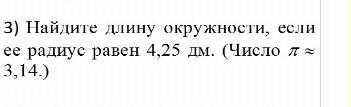 Формула длины окружности: Число пи на диаметр. Радиус это половина диаметра значит: 4,25*2= 8,5 дм. (диаметр)