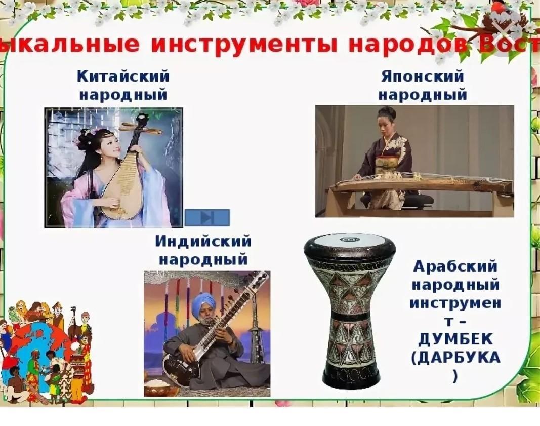 Какие народные музыкальные инструменты к итайского,японского,индийского,арабского народа ты знаешь?