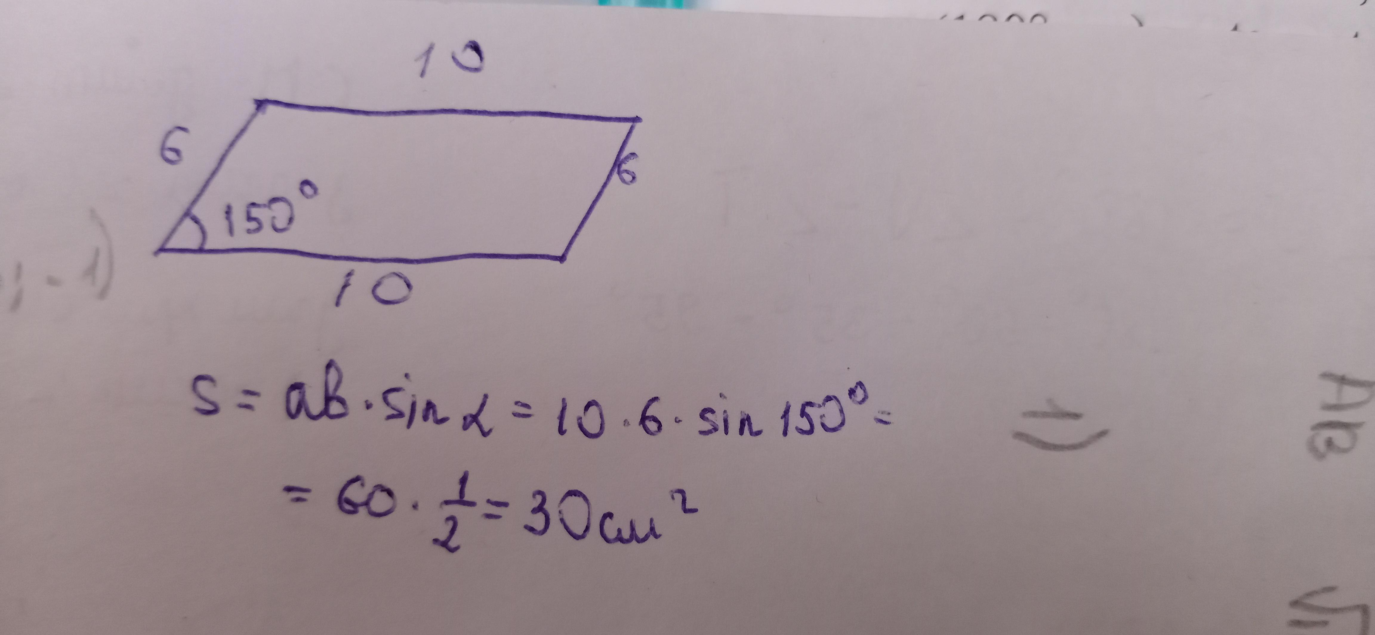 Стороны параллелограмма равны 10 см и 6 см, а угол между ними 150°. Найдите площадь этого параллелограмма.