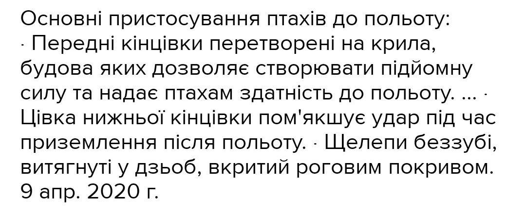 Основні пристосування птахів до польоту: · Передні кінцівки перетворені на крила, будова яких дозволяє створювати підйомну силу та надає птахам здатність до польоту. ... · Цівка нижньої кінцівки пом'якшує удар під час приземлення після польоту. · Щелепи беззубі, витягнуті у дзьоб, вкритий роговим покривом.9 апр. 2020 г.