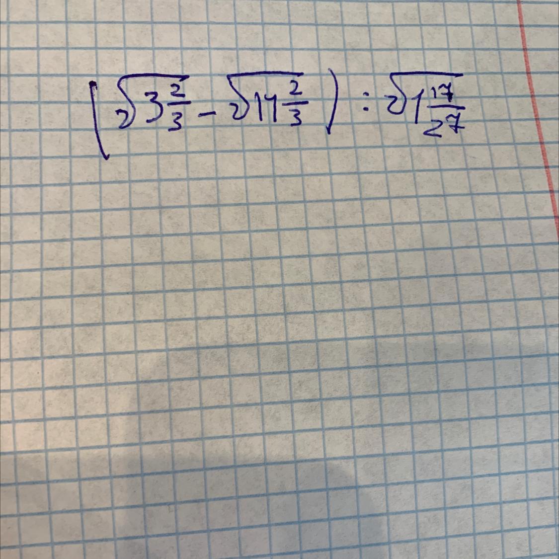 [ √ (3 2/3) - √ ( 14 2/3) ] : √ ( 1 17/27) = [ √ (11/3 ) - √ (44/3 ) ] * √ ( 27/4 ) =