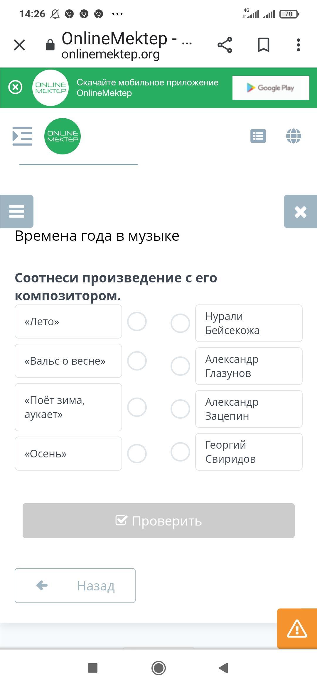 Нурали -Осень, Свиридов- Поет зима аукает, Зацепин-Вальс о весне, Глазунов - Лето
