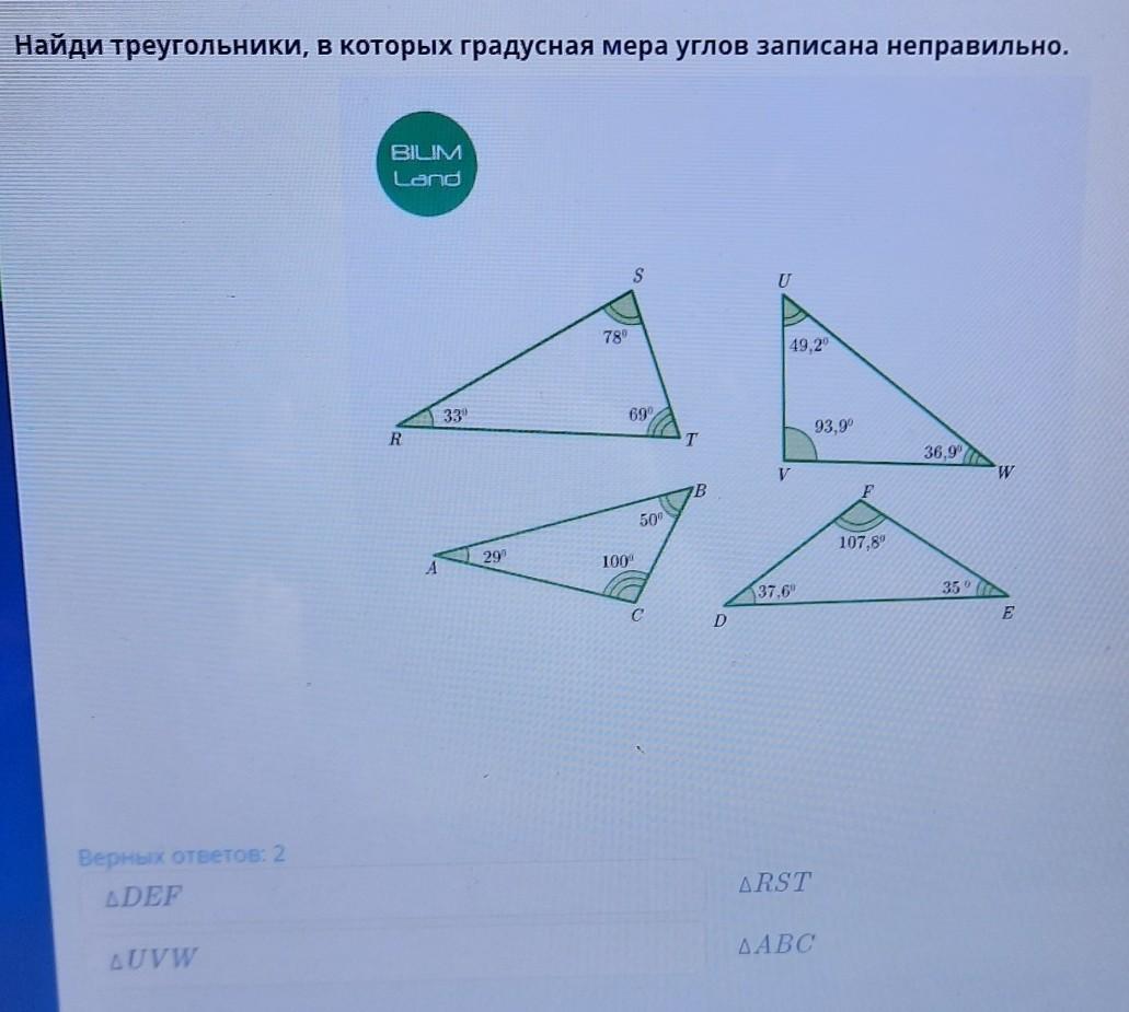 Сумма углов треугольника по теореме равна 180 градусов, в АBC сумма меньше 180 градусов, что не подходит, а в DEF наоборот больше 180.
