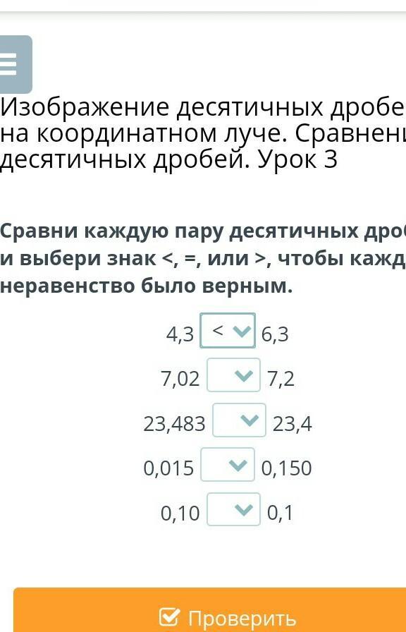 сравни каждую пару дясятичных дробей и выбери знак <,=,> чтобы каждое не равенство было верным