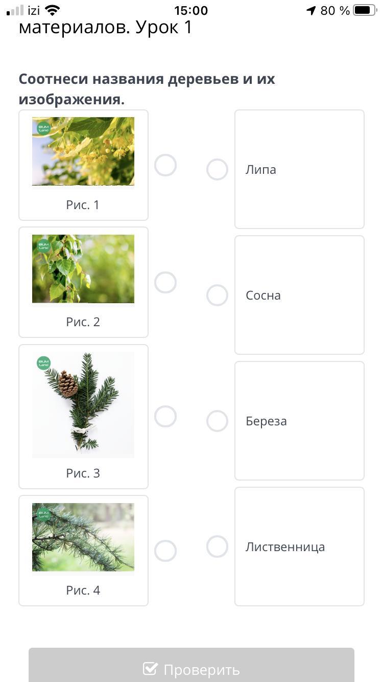 1-липа,2-берёза,3-сосна,4-лиственница.