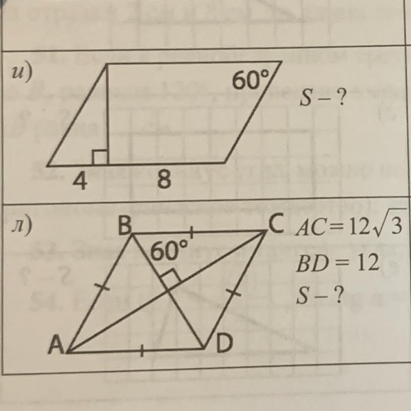 u) Если одна сторона 60*, значит другая будет 120*, соответственно угол, который находится в левом нижнем будет 60*, один прямой 90*, и другой 30*. Это теорема, соответственно, если маленький катет 4, значит гипотенуза будет равна 4 умножить на 2= 8. Площадь равна 4+8 = 12 умножить на сторону 8. 12 умножить на 8 = 96.