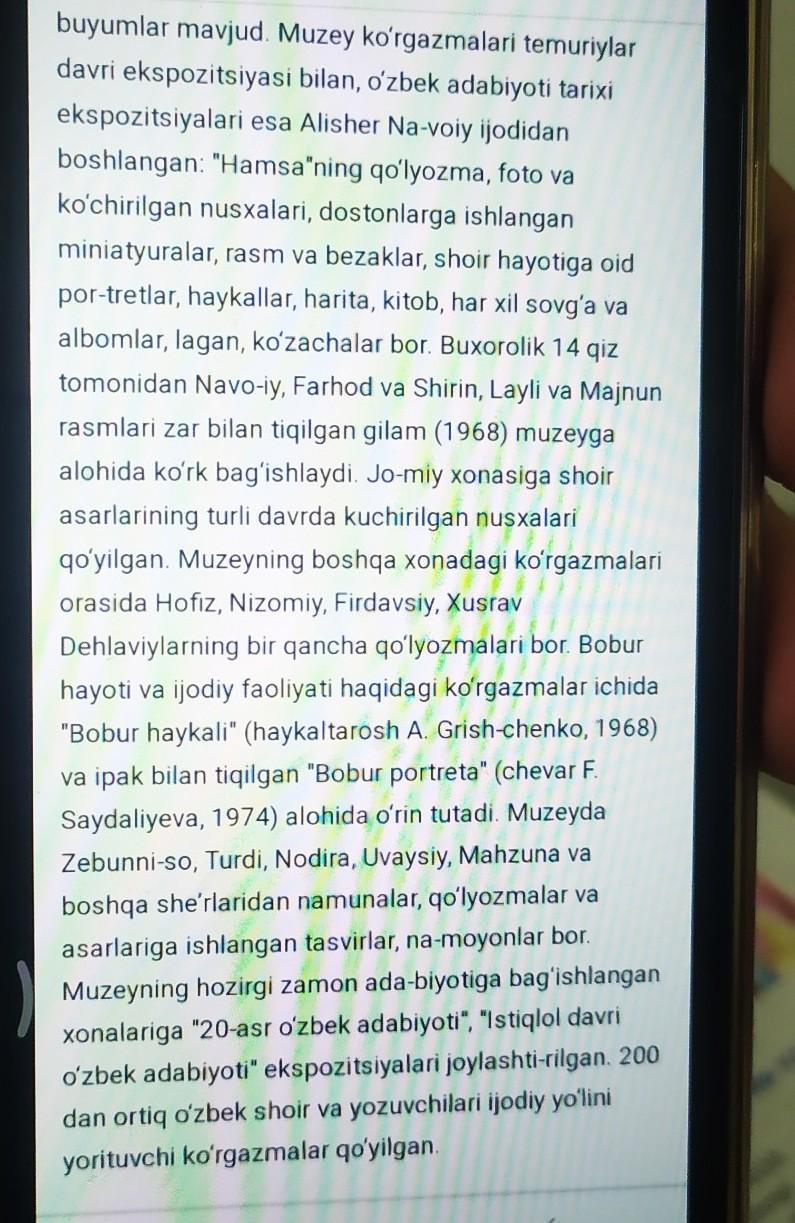 1.Muzeyning hozirgi zamon adabiyotiga bag'ishlangan xonlariga qanday ekspozitsiyalarjoylashtirilgan?