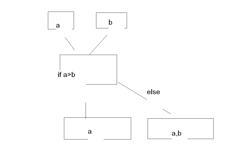 Нарисуйте блок-схему.Даны два числа.выведите на экран первое из них, если оно больше второгл, и оба числа, если это не так
