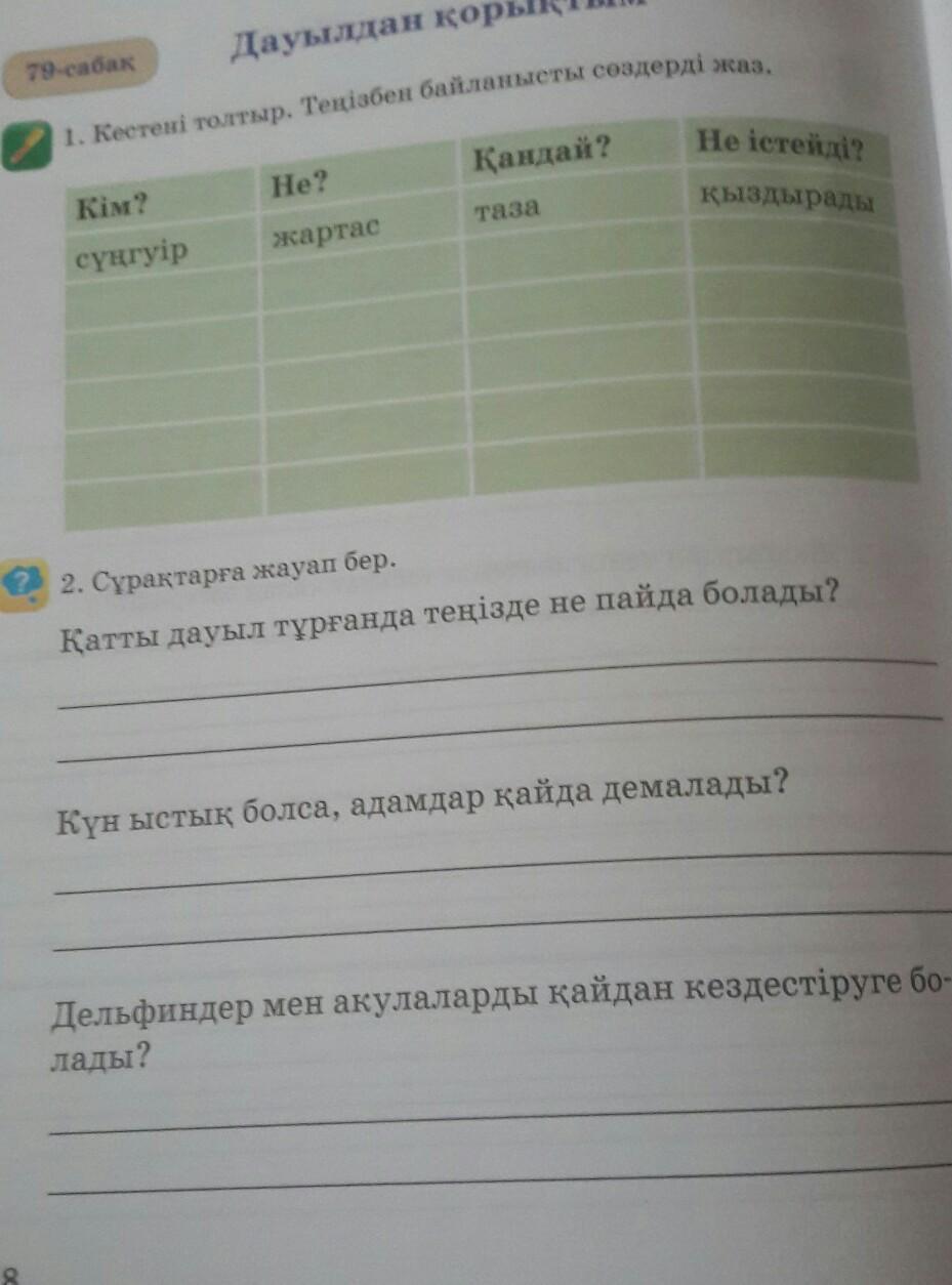 1. Кестені толтыр. Теңізбен байланысты сөздерді жаз.