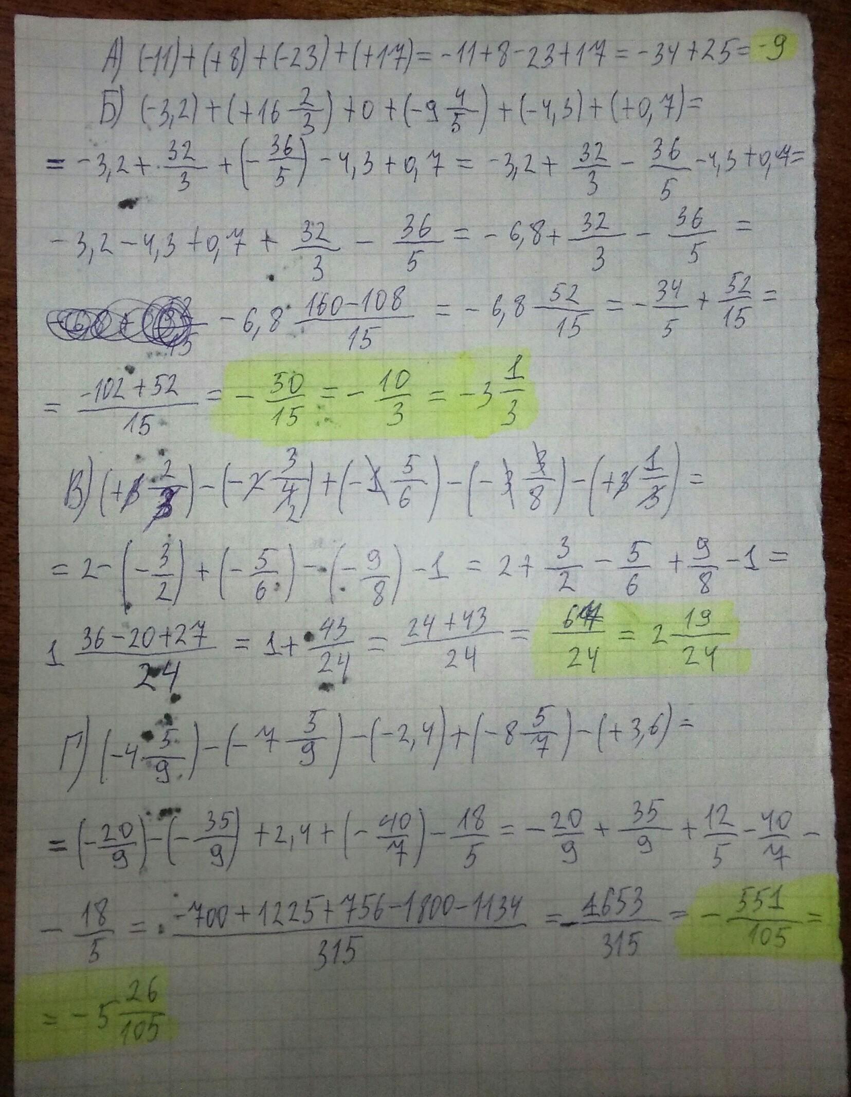 Б) (-3,2)+(+16 2/3)+0+(-9 4/5)+(-4,3)+(+0,7)=1/15