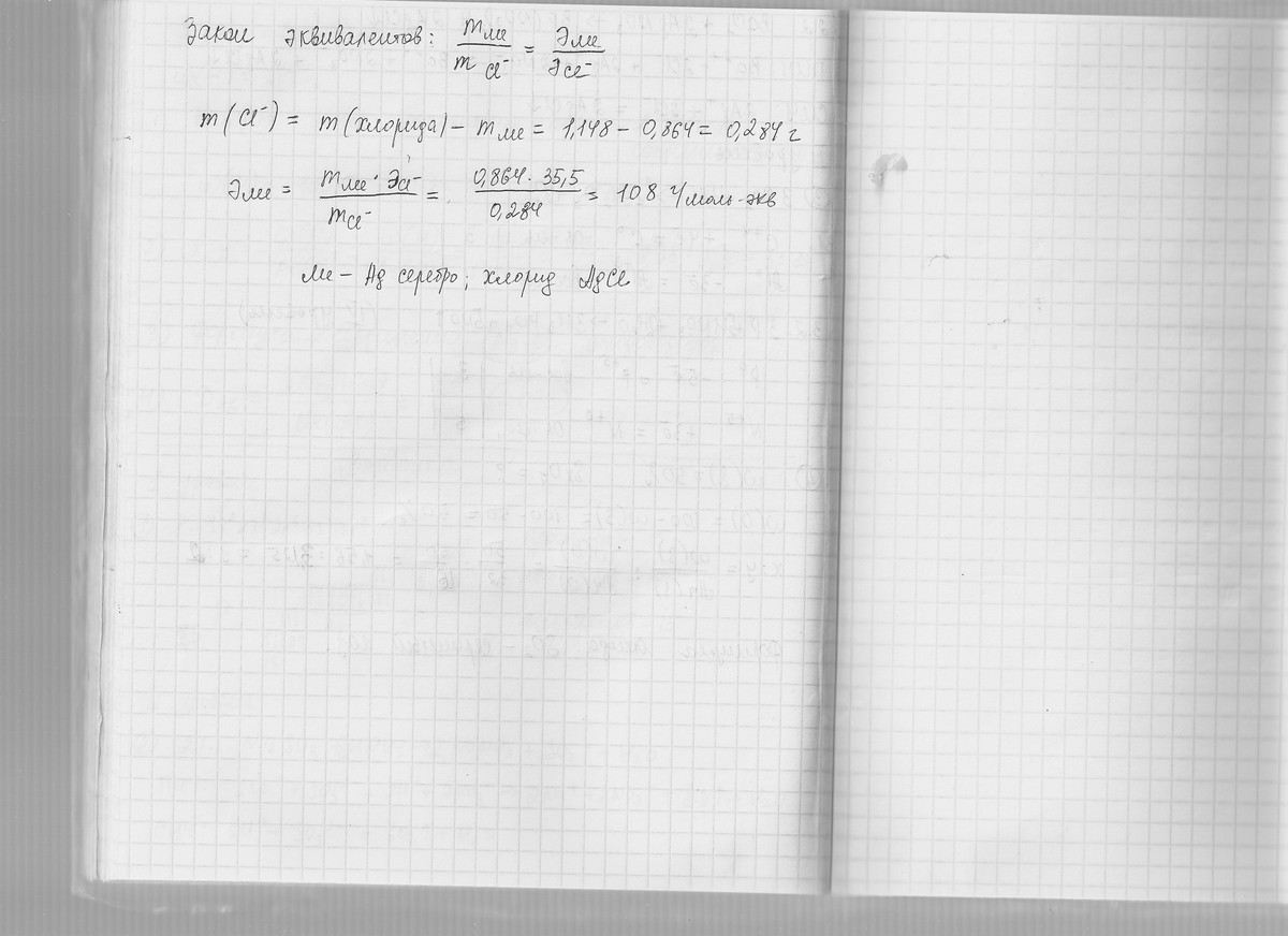 m(Me)/Mэ(Ме)=m(Cl)/Mэ(Cl)тогда Мэ(Ме)=0,864*35,5/0,284=108 г/моль . Это - серебро