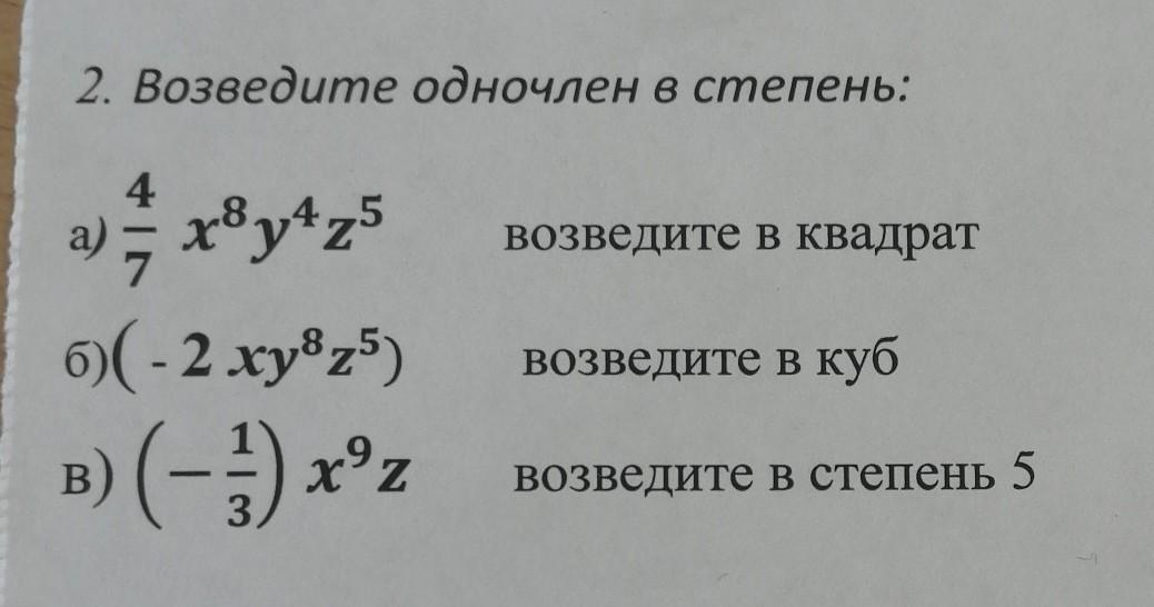 а) (4/7 x8 y4 z5) возводим в квадрат = 16/49 х16 у8 z25