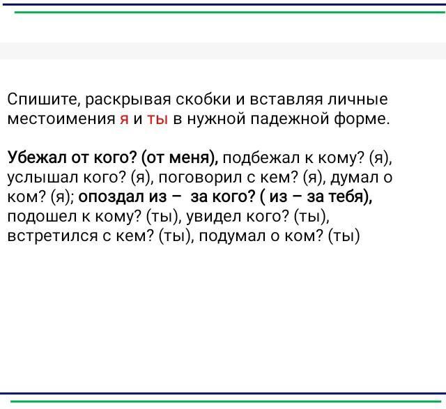 подбежал к кому? к тебе (Д.п.) , услышал от кого? от меня (Р.п), поговорил с кем? со мной (Т.п.), домал о ком? обо мне (П.п),