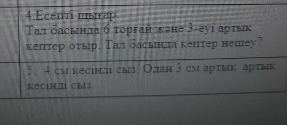 4.Есепті шығар . Тал басында 6 торғай және 3 - еуі артык кептер отыр . Тал басында кептер нешеу 5. 4 см кесінді сыз . Одан 3 см артык артык сыз