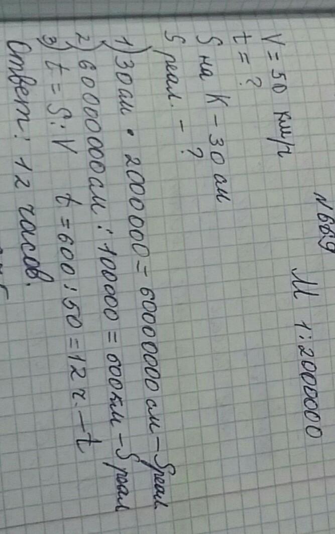 Скорость поезда 50 км/ч. За какое время пройдет поезд расстояние, которому на карте с масштабом 1 : 2 000 000 соответствует отрезок длинной 30 см?