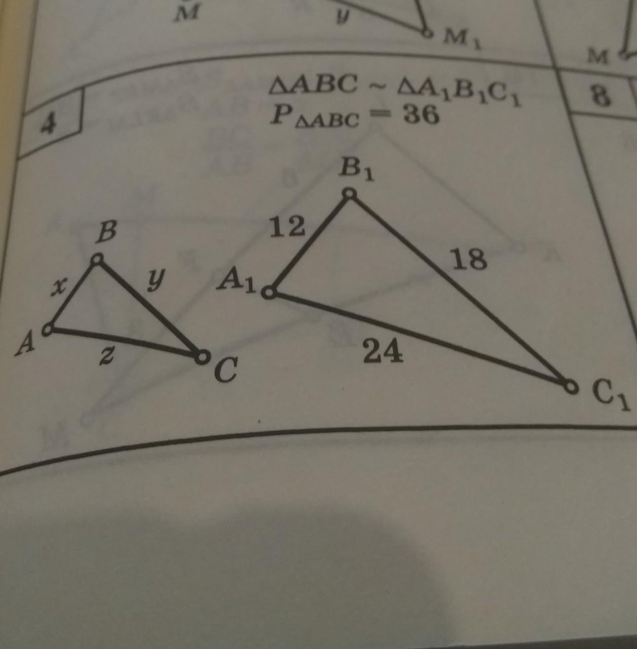 Треугольники подобны, значит, их все линейные размеры различаются в k раз: kx = 12, ky = 18, kz = 24.