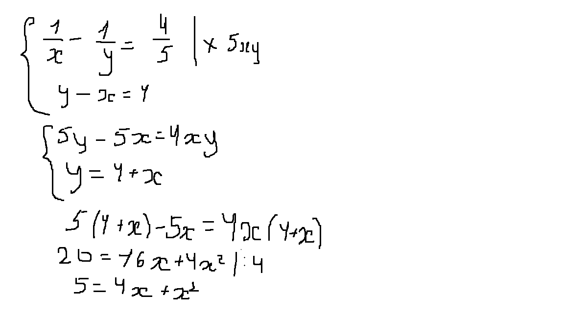Приведем к общему знаменателю 1 уравнение 5у-5х=4ху, 5(у-х)=4ху.