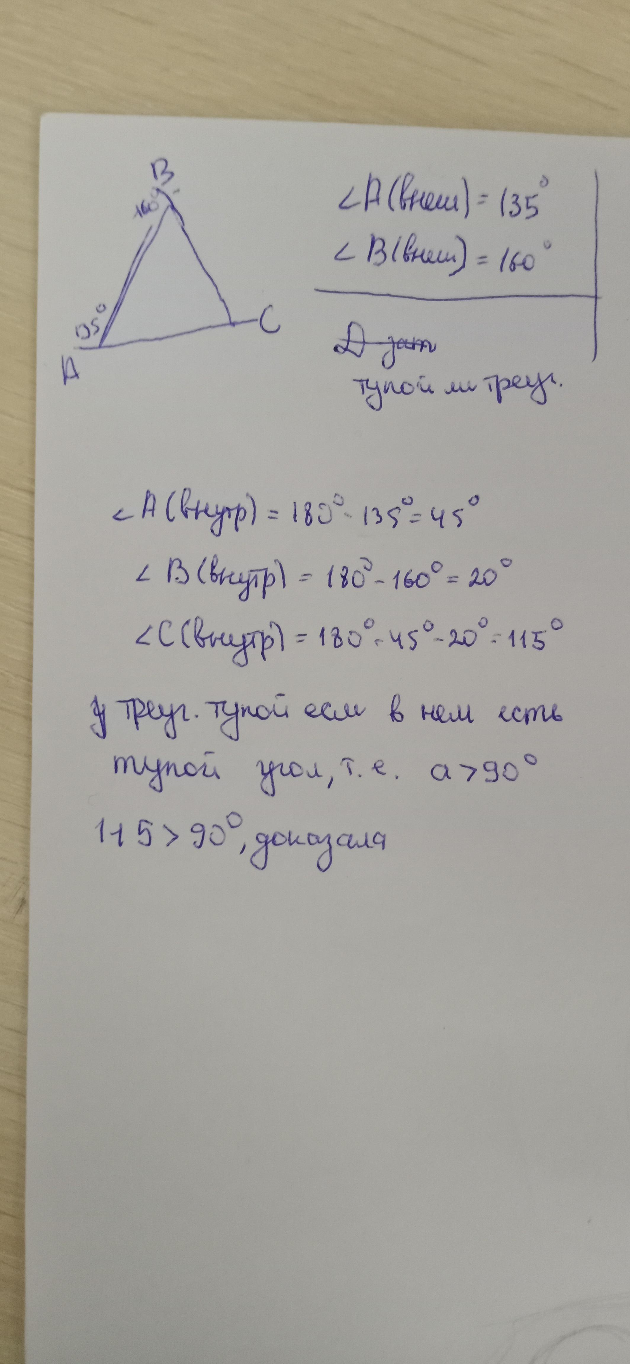 Определите, является ли треугольник АВС тупоугольным, если два его внешних угла равны 135° и 160°. пж на листочке с дано и решение и тертеж