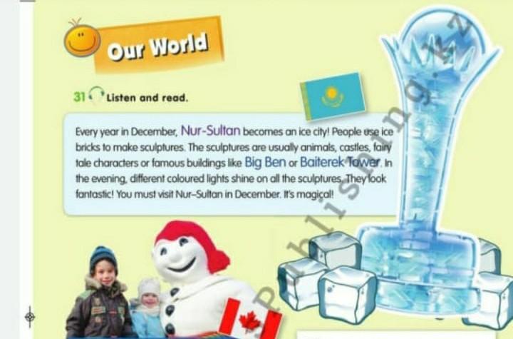 Каждый году в Декабрь,Нур-Султане проходит леденой город.Люди използуют куски льда чтобы сделать скулптуры.Некоторые скулптуры животные,заметь,высокие балет но самый скулптуры которые все время делают из них лёд это Биге Бен и Бәйтерек.ты должен поситить Нур-Султан когда будет декабрь.Это будет магическии!